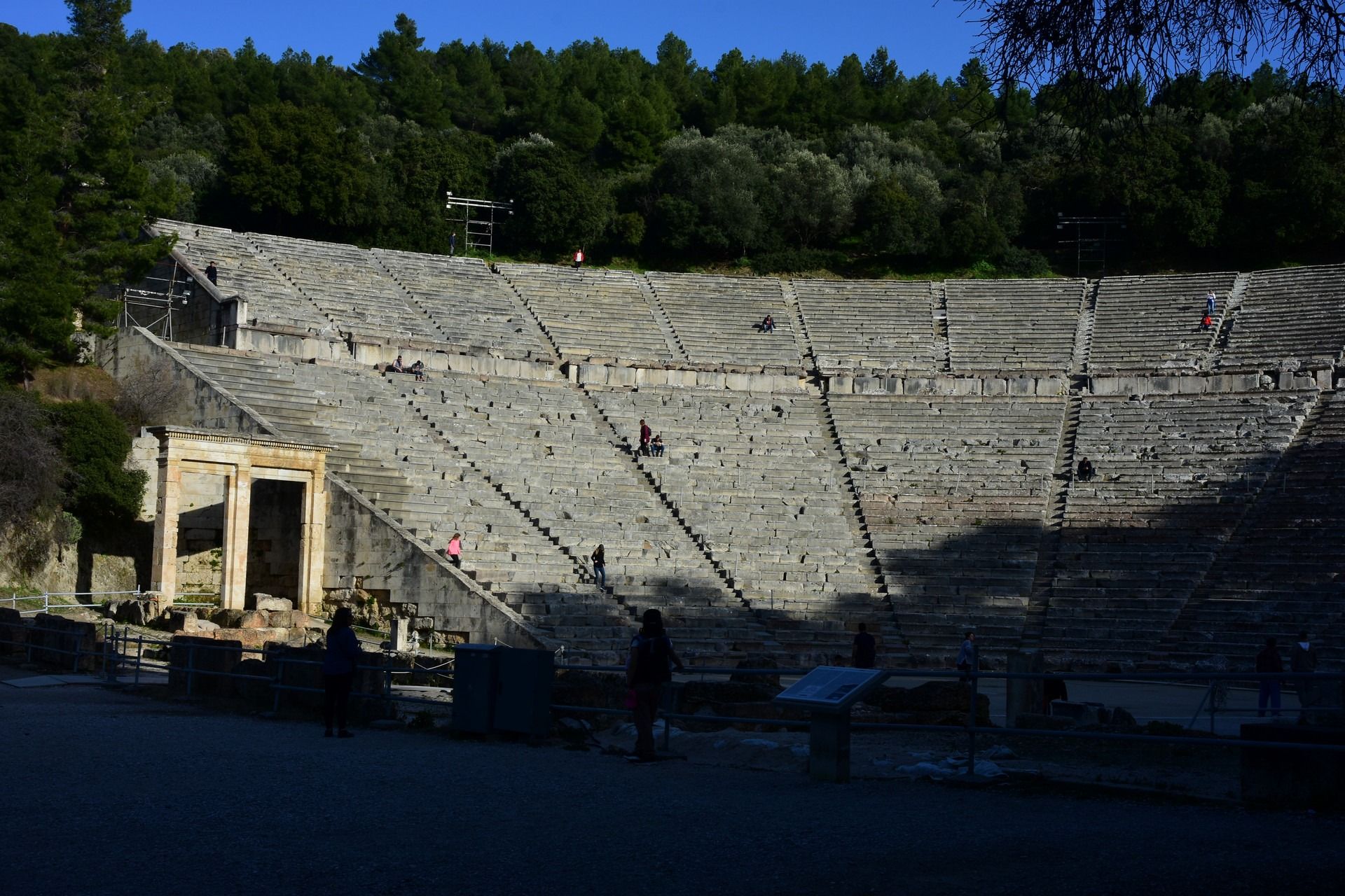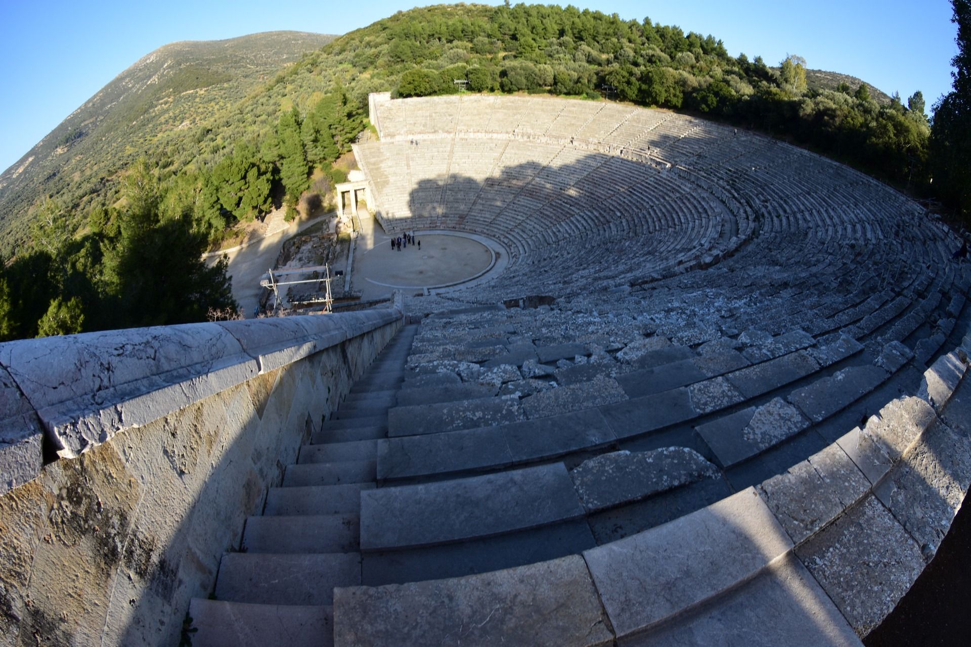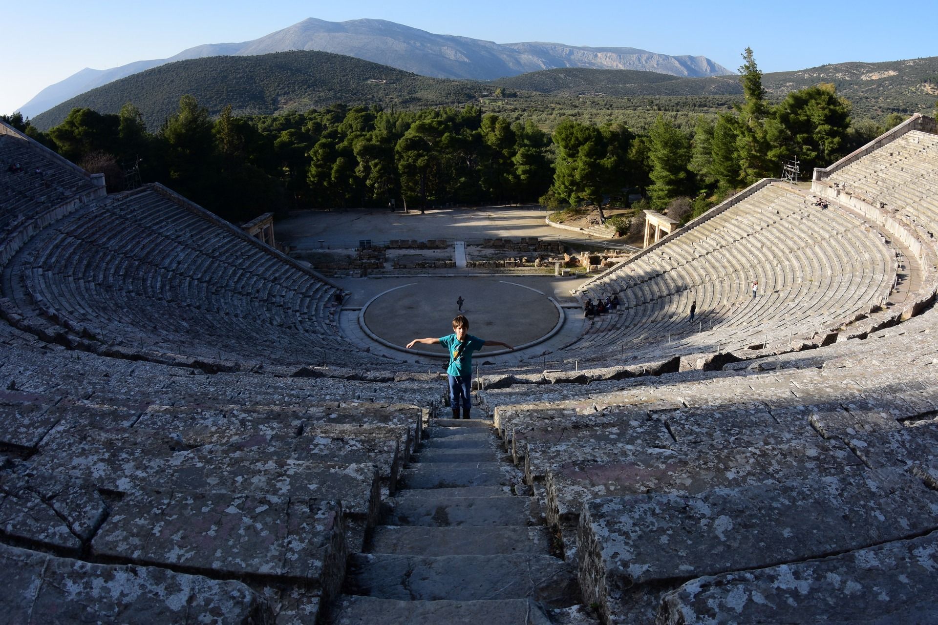 The Ancient Theatre of Epidaurus is a theatre near the Greek city of Epidaurus, located on the southeast end of the sanctuary dedicated to Asclepius, the ancient Greek God of medicine. It is built on the west side of Cynortion Mountain. It is considered to be the most perfect ancient Greek theatre with regard to acoustics and aesthetics. According to Pausanias, the ancient theatre was constructed at the end of the 4th century BC by the architect Polykleitos the Younger. Pausanias praises the theatre for its symmetry and beauty. At a maximum capacity of approx 14,000 spectators, the theatre hosted music, singing and dramatic games that were included in the worship of Asclepius. It was also used as a means to heal patients, since there was a belief that the observation of dramatic shows had positive effects on mental and physical health. Today, the monument attracts a large number of Greek and foreign visitors and is used for the performance of ancient drama plays. The first modern performance conducted at the theatre was Sophocles’s tragedy Electra in 1938. While WWII interrupted performances in the these rsumed in 1954, in the framework of the organized festival – The Epidaurus Festival (during summer).