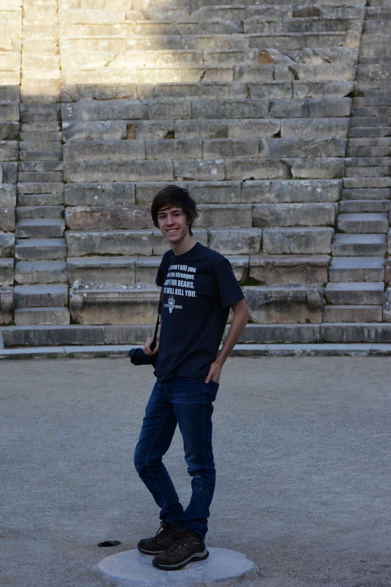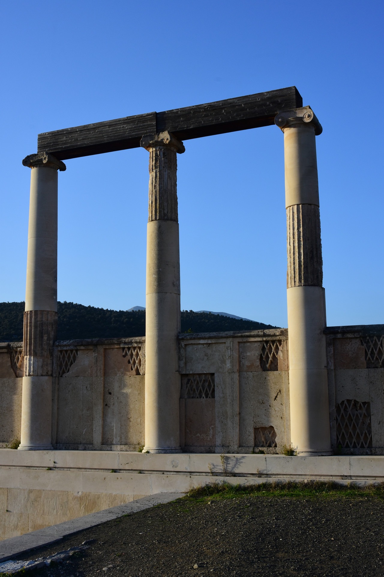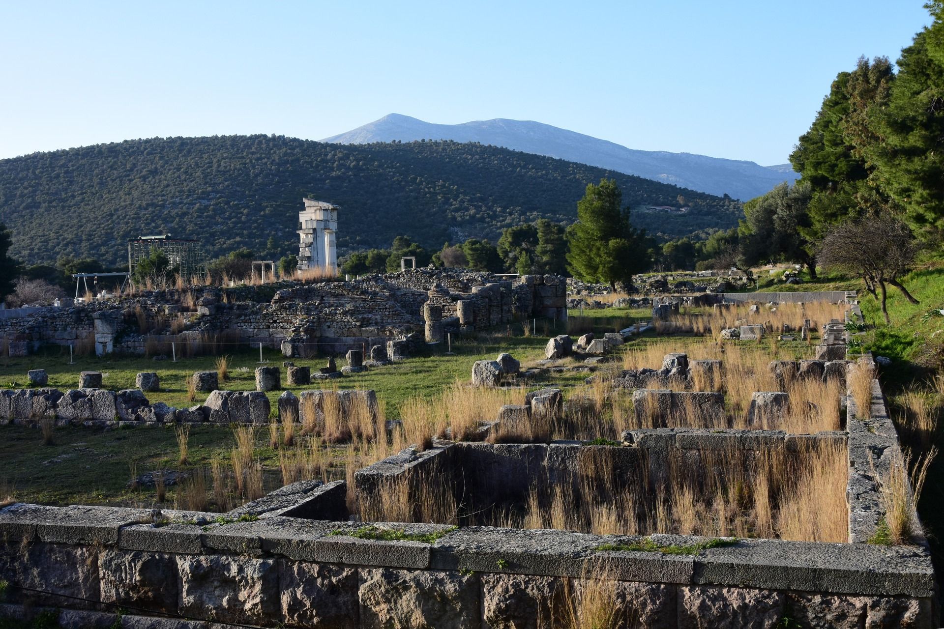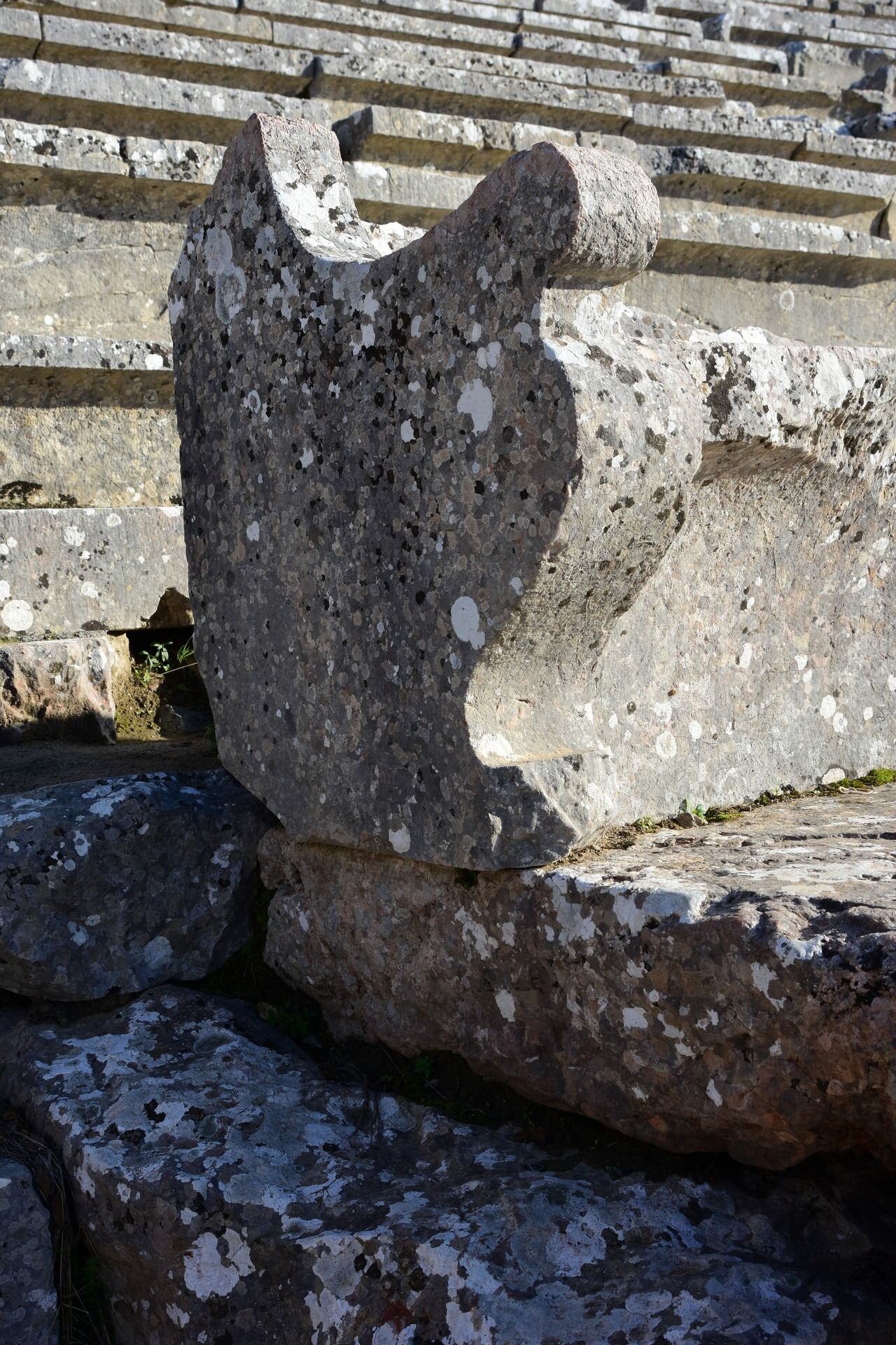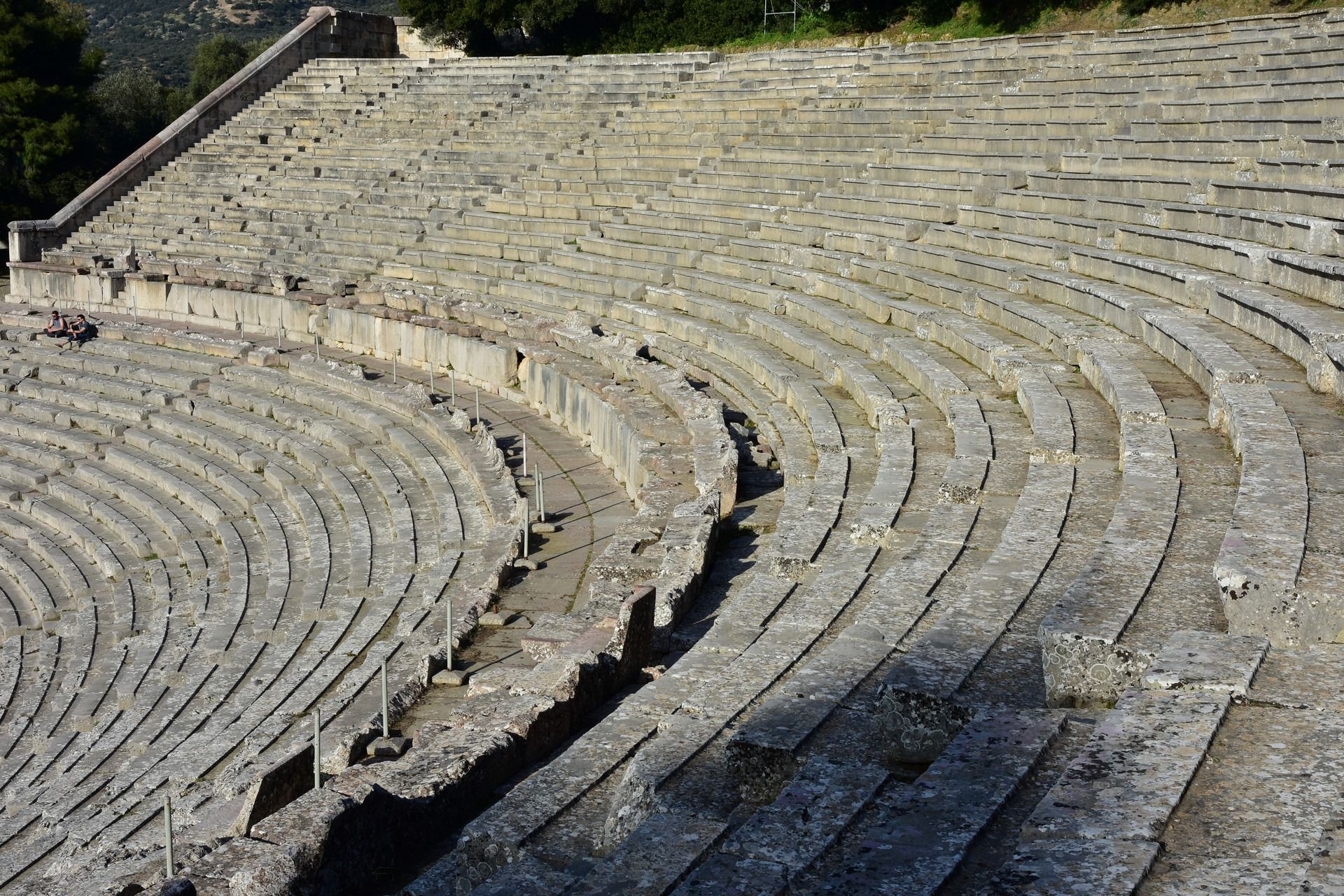 The monument retains the characteristic tripartite structure of a Hellenistic theatre that has an auditorium, orchestra and staging building. During Roman times, the theatre (unlike many Greek theatres) did not suffer any modifications. The auditorium is divided vertically into two unequal parts, the lower hollow or theatre and the upper theatre or epitheatre. The two sub-sections are separated by a horizontal corridor for the movement of spectators, the frieze. The lower part of the auditorium wedge is divided into 12 sections, while the upper part is divided into 22 sections. The lower rows of the upper and lower auditoriums have a presidency form, namely places reserved for important people. The design of the auditorium is unique and based on three marking centres. Due to this special design, the architects achieved both optimal acoustics and an opening for better viewing. The circular orchestra, with a diameter of 20 m, constitutes the centre of the theatre. In the centre is a circular stone plate, the base of the altar or thymele. The orchestra is surrounded by a special underground drainage pipeline called the euriposm which is covered by a circular stone walkway.