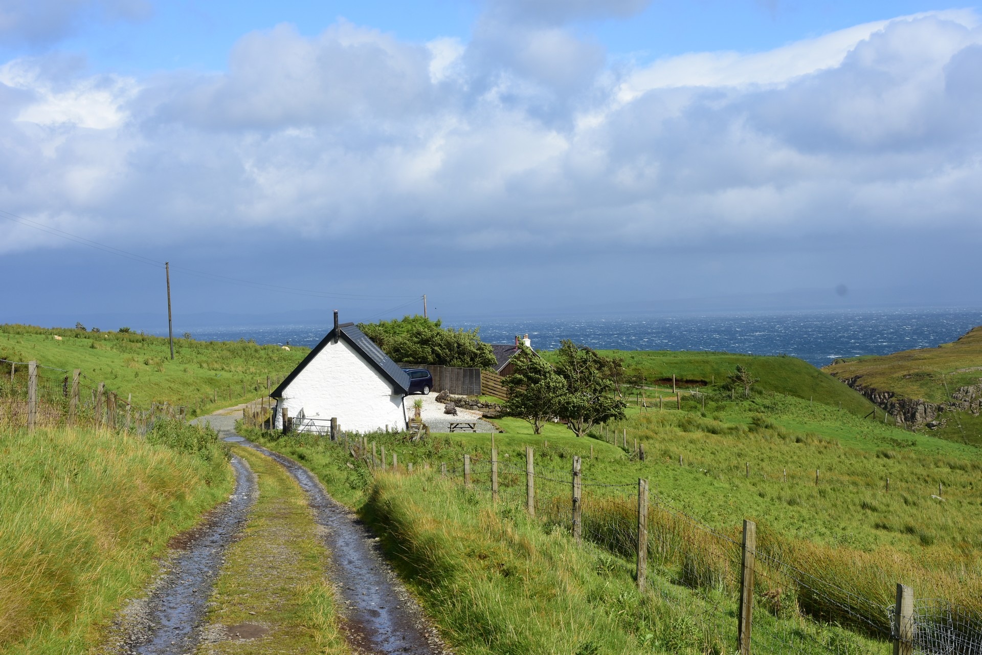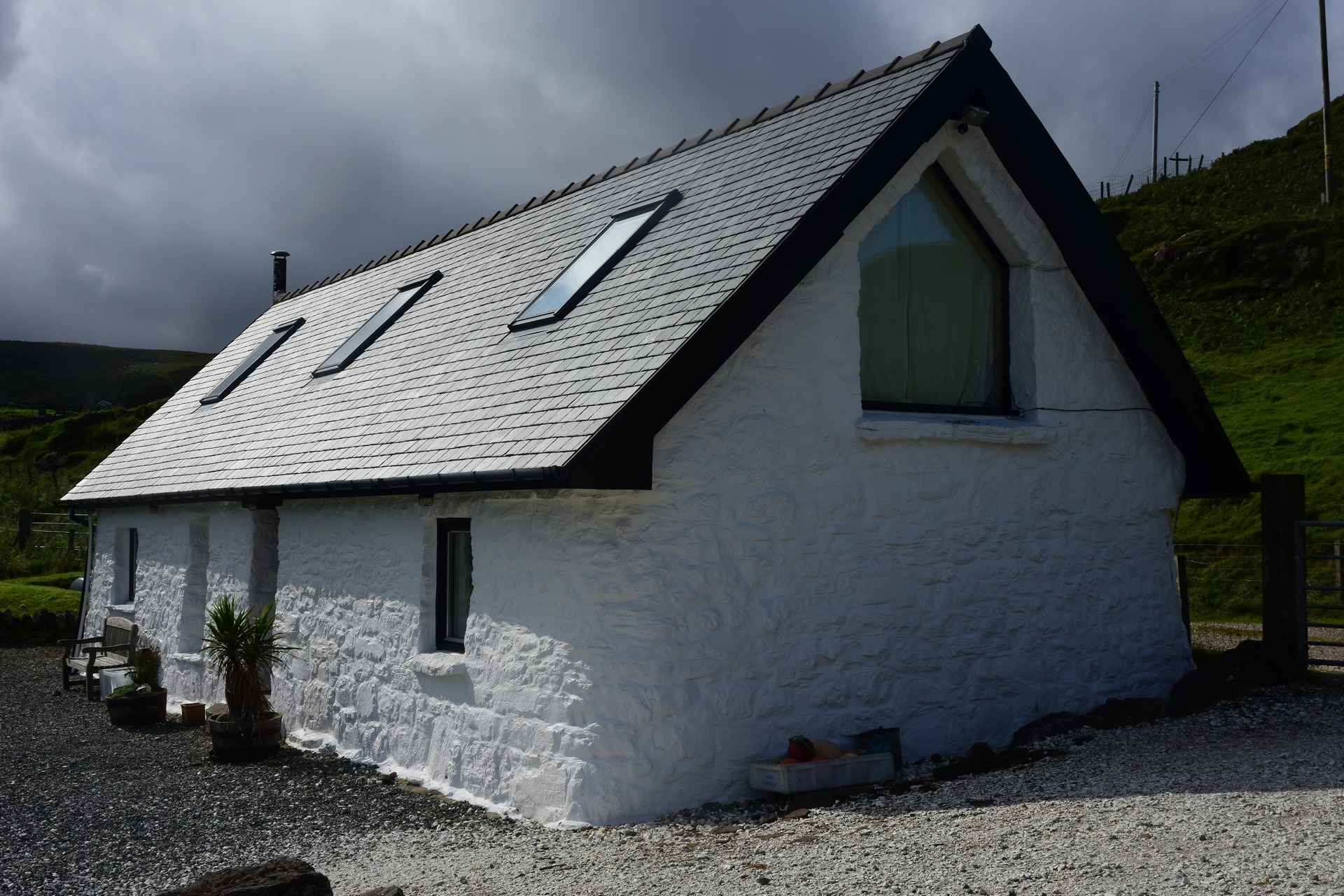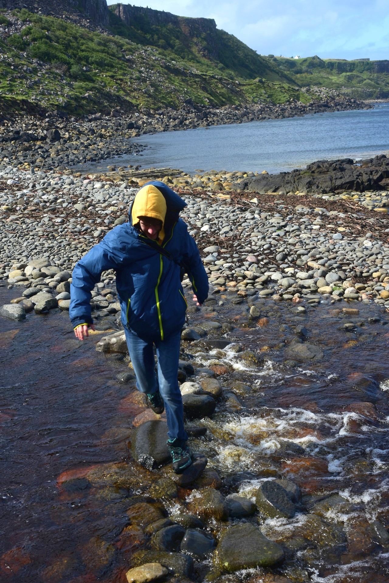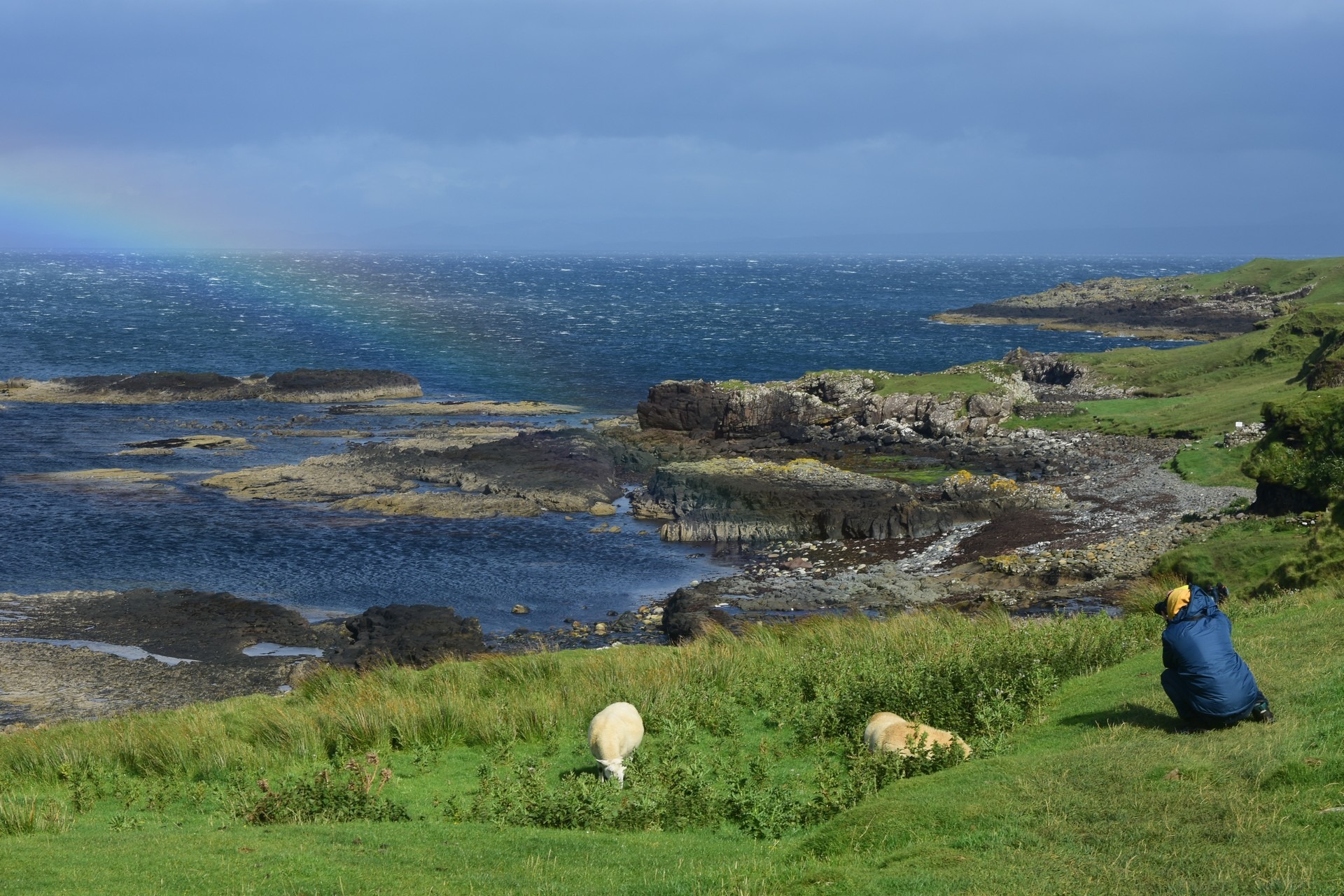 When we arrive at trailhead to Brother’s Point – Rubha nam Brathairean – the weather clears enough for the sun, and rainbows… it’s still windy, slippery down the trail, but it’s a relatively short and splendid walk down to the sea. Trail passes near ruins of Roderick MacDonald’s (Ruaraidh Dhòmhnaill a’ Chùirn) house, whose family lived there until the late 19th century. The story behind the name might refer to monks living in the secluded area in 6th century.