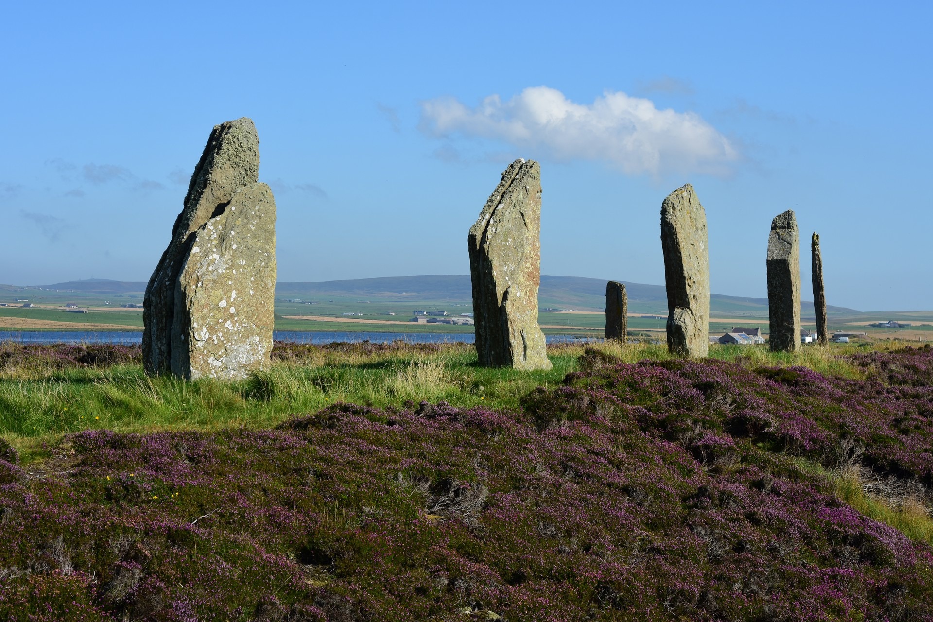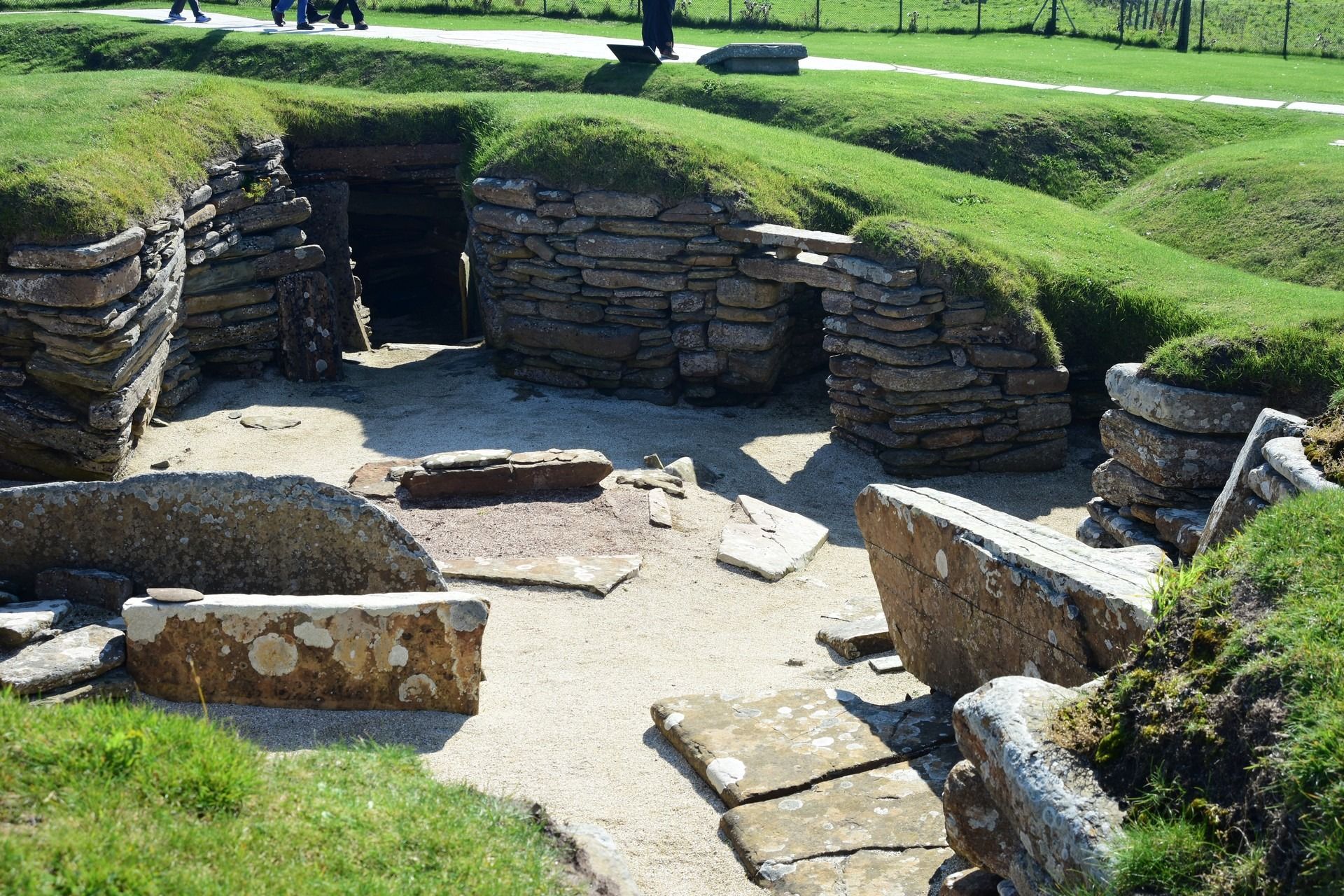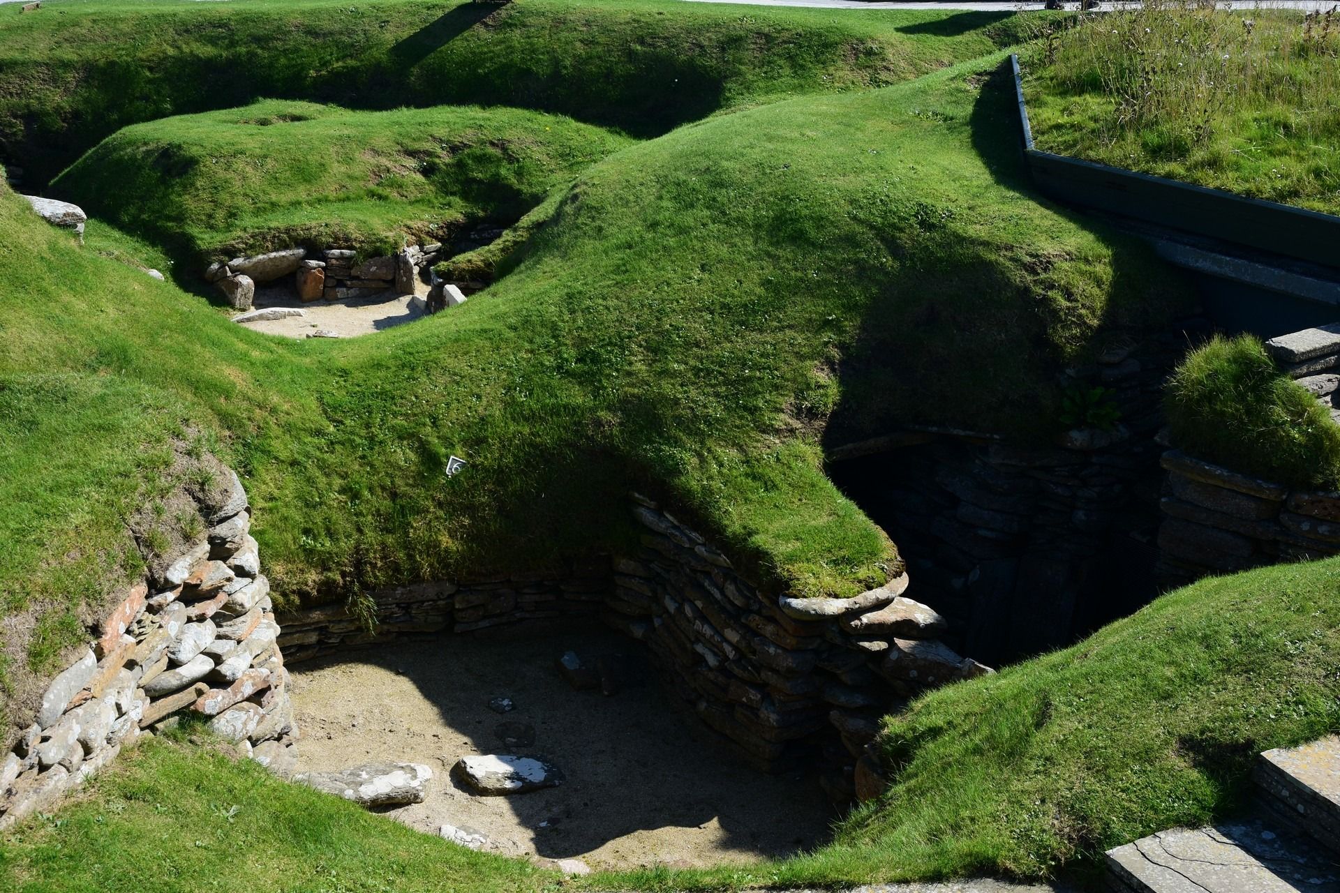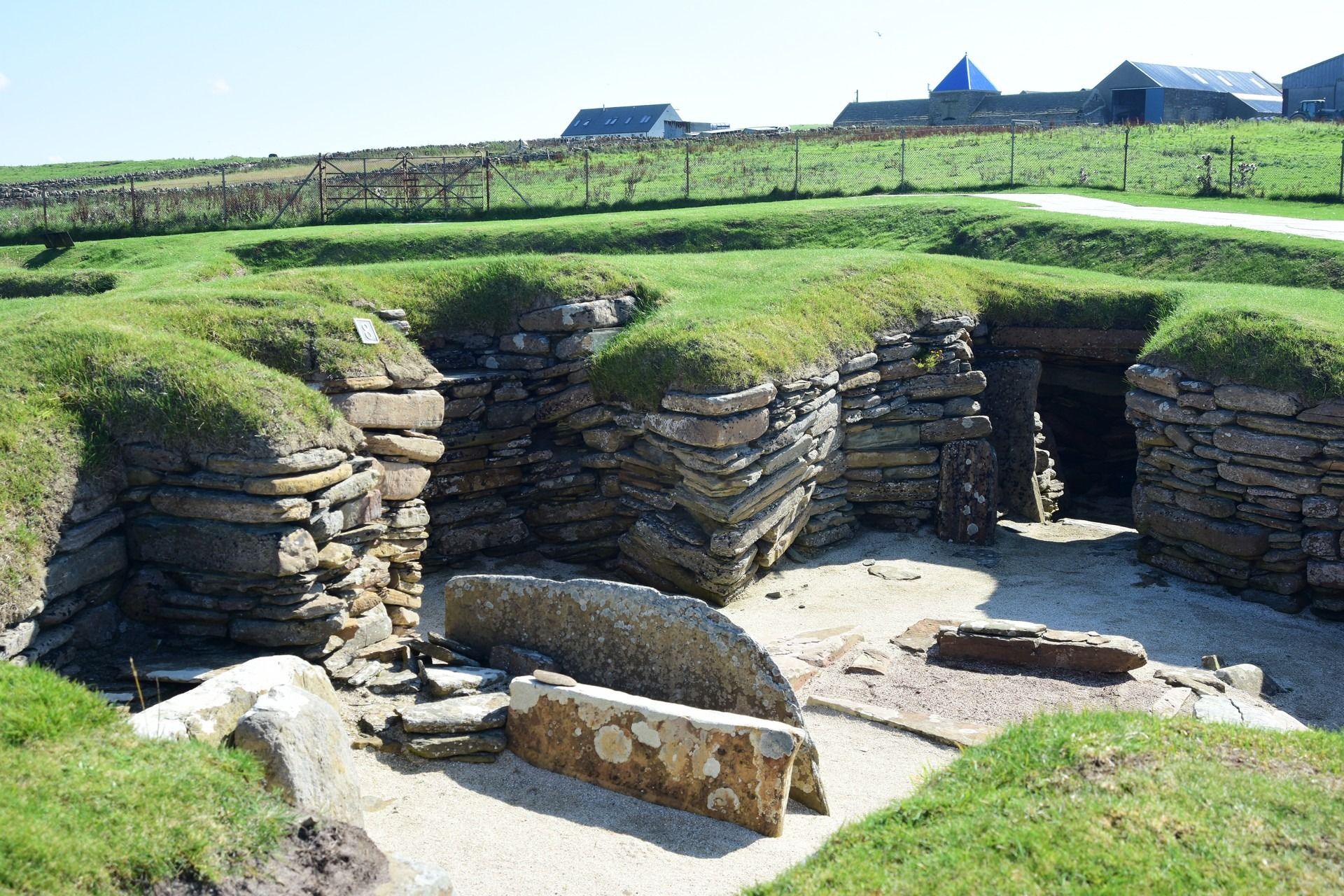 The local people are known as Orcadians; they speak a distinctive dialect of the Scots language and have a rich body of folklore. Orkney contains some of the oldest and best-preserved Neolithic sites in Europe; the “Heart of Neolithic Orkney” is a designated UNESCO World Heritage Site including, among other sites, Skara Brae – a stone-built Neolithic settlement, located on the Bay of Skaill on the west coast of Mainland, the largest island in the Orkney archipelago of Scotland. Consisting of ten clustered houses, made of flagstones, in earthen dams that provided support for the walls; the houses included stone hearths, beds, and cupboards. A primitive sewer system, with “toilets” and drains in each house, carried effluent to the ocean. The site was occupied from roughly 3180 BC to about 2500 BC and is Europe’s most complete Neolithic village. Older than Stonehenge and the Great Pyramids of Giza, it has been called the “Scottish Pompeii” because of its excellent preservation.