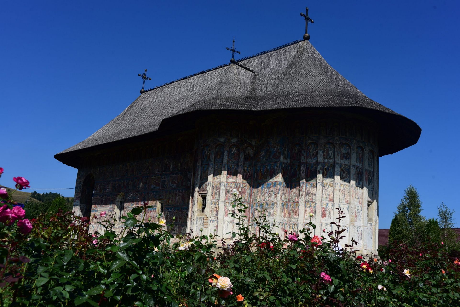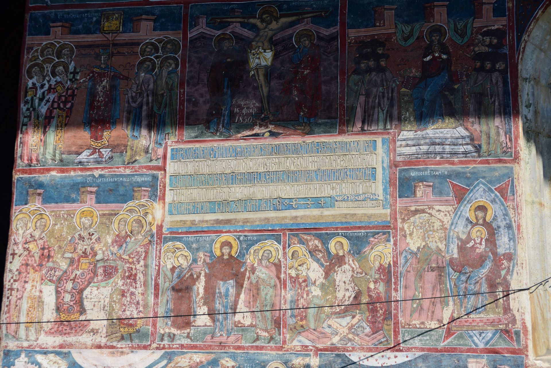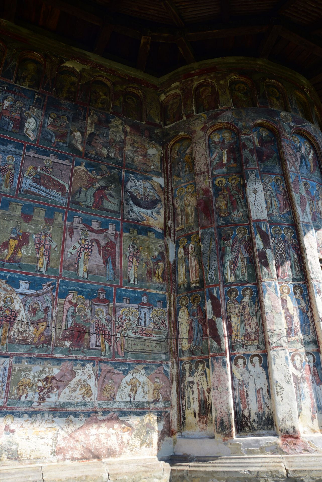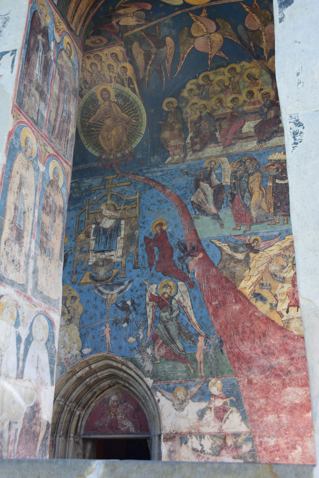 Humor Monastery was one of the first of Moldavia’s painted monasteries to be frescoed and, along with Voroneţ, is probably the best preserved. The dominant colour of the frescoes is a reddish brown. The master painter responsible for Humor’s frescoes, which were painted in 1535, is one Toma of Suceava. The subjects of the frescoes at Humor include the Siege of Constantinople and the Last Judgment, common on the exterior of the painted monasteries of Bucovina, but also the Hymn to the Virgin inspired by the poem of Patriarch Sergius of Constantinople.