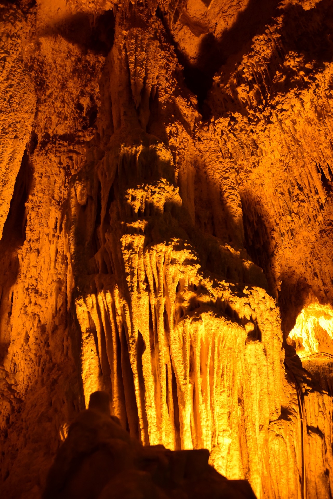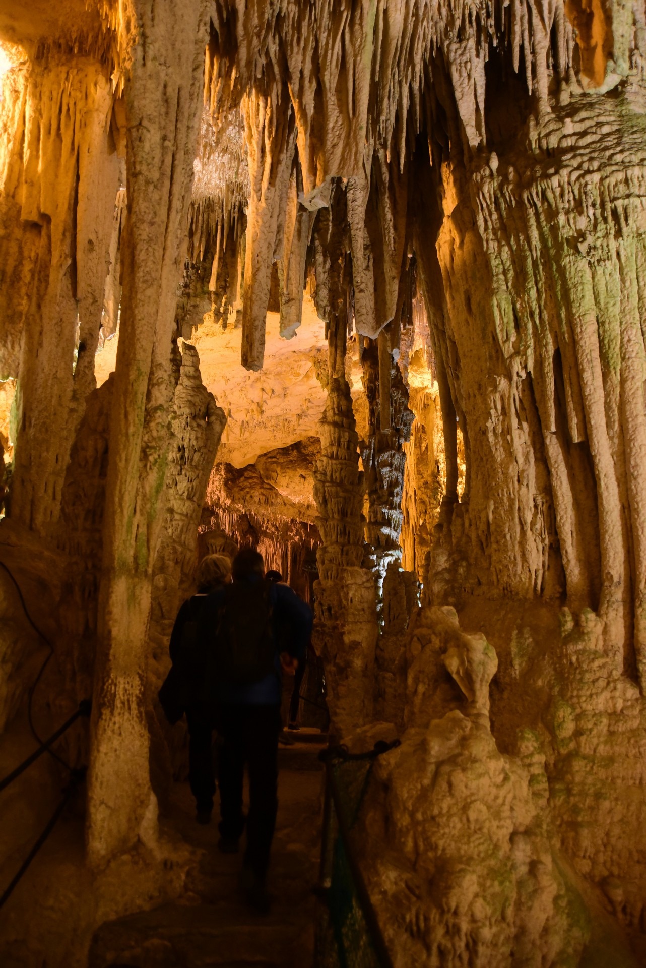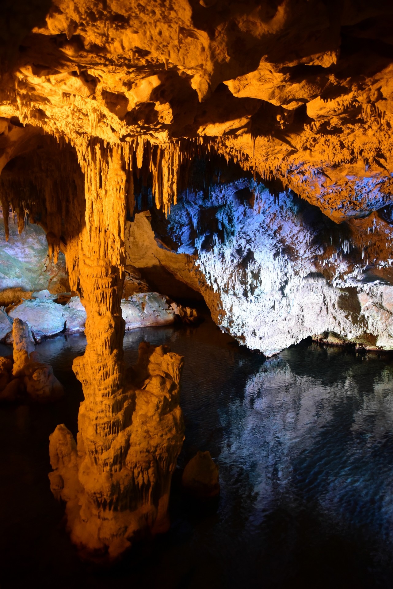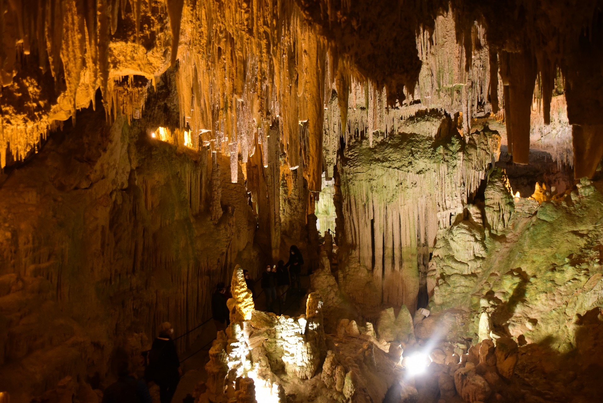 The combined length of the cave system is estimated to be around 4 kilometers, but only a few hundred metres are accessible to the public.Inside are passages of lit stalactite and stalagmite formations, and a 120-metre-long saltwater lake, which is at sea level. The cave was once a habitat for the Mediterranean monk seal, which has become extinct in the area.