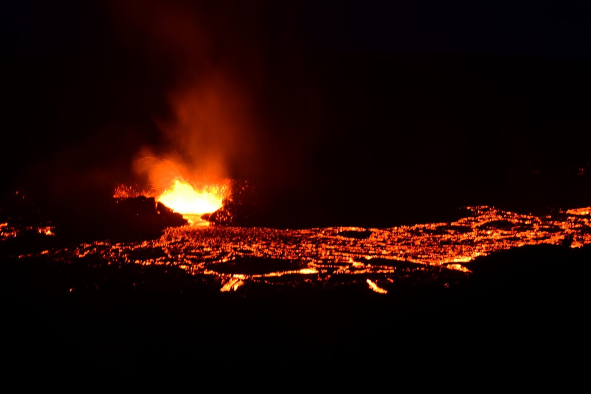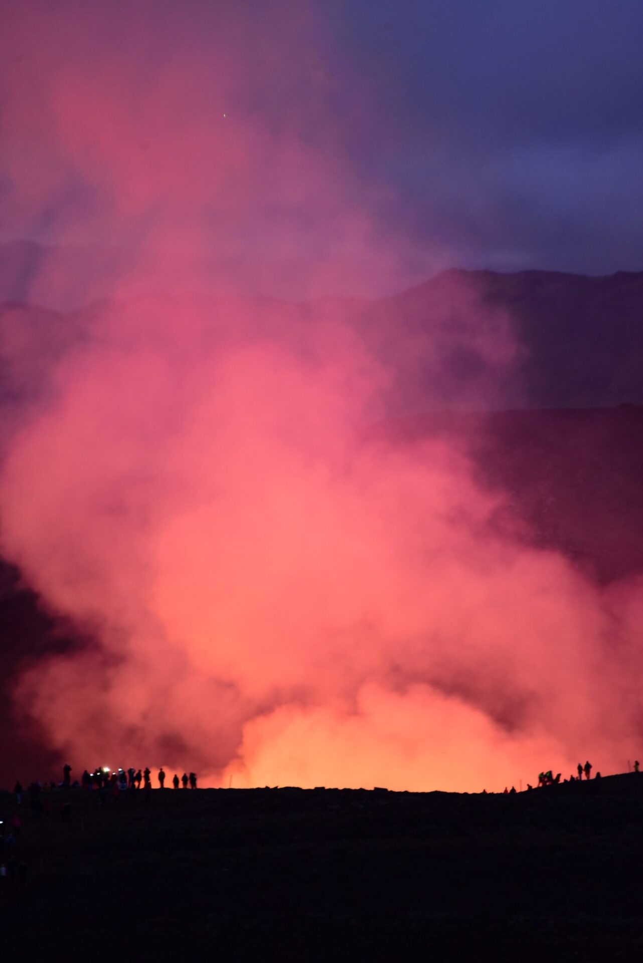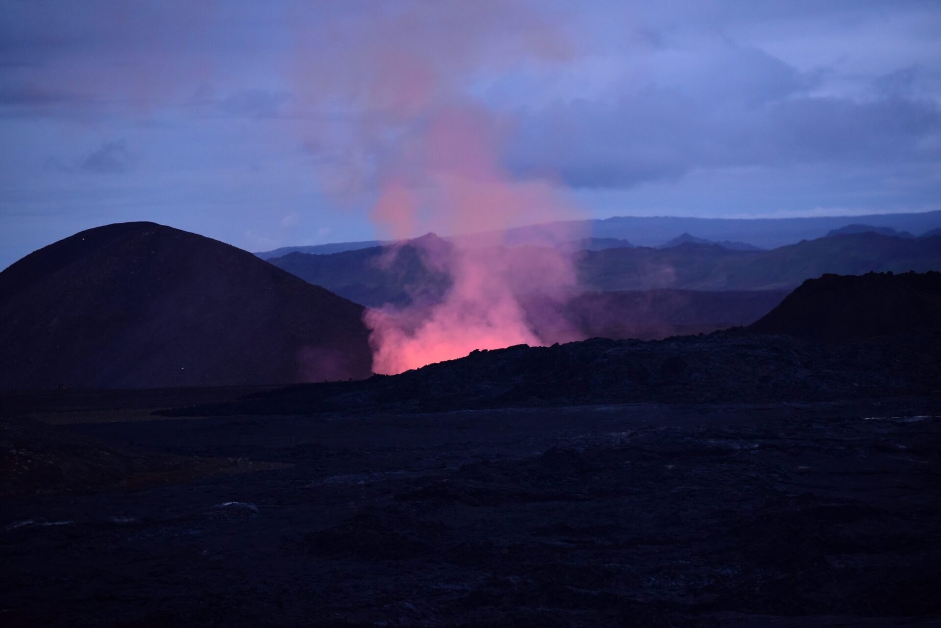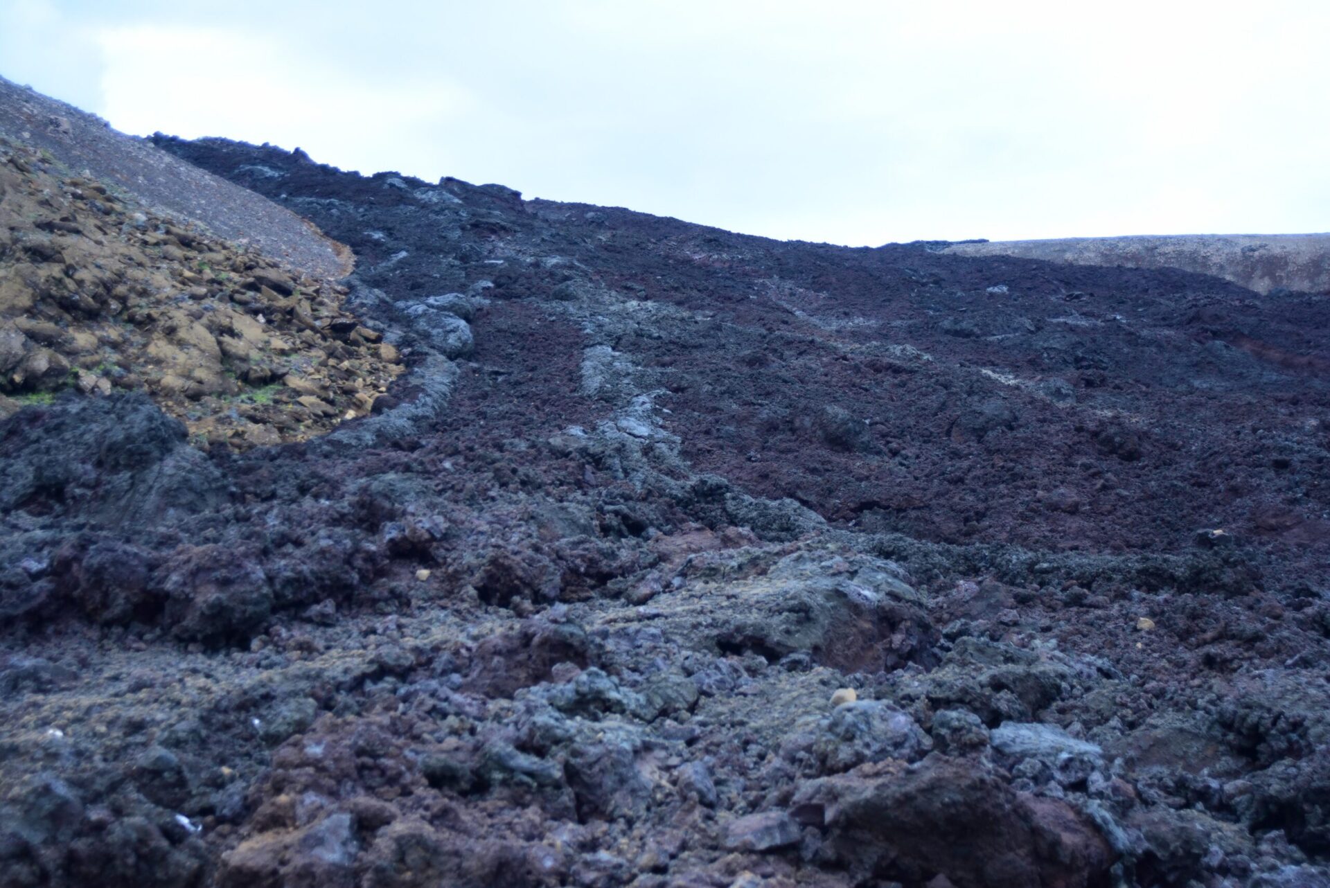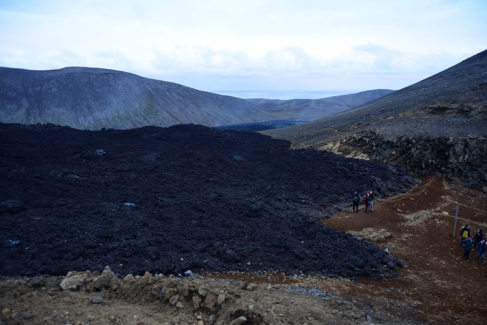Back in Grindavik campground we put up a tent to make sure we have a place to sleep when we return from the volcano and set off. First amazement comes when we come up to the lava dam where we parted the volcano last year. Then the lava was far away still. Today – it fills the valey beyond with tongues rising above if just about to spill over.