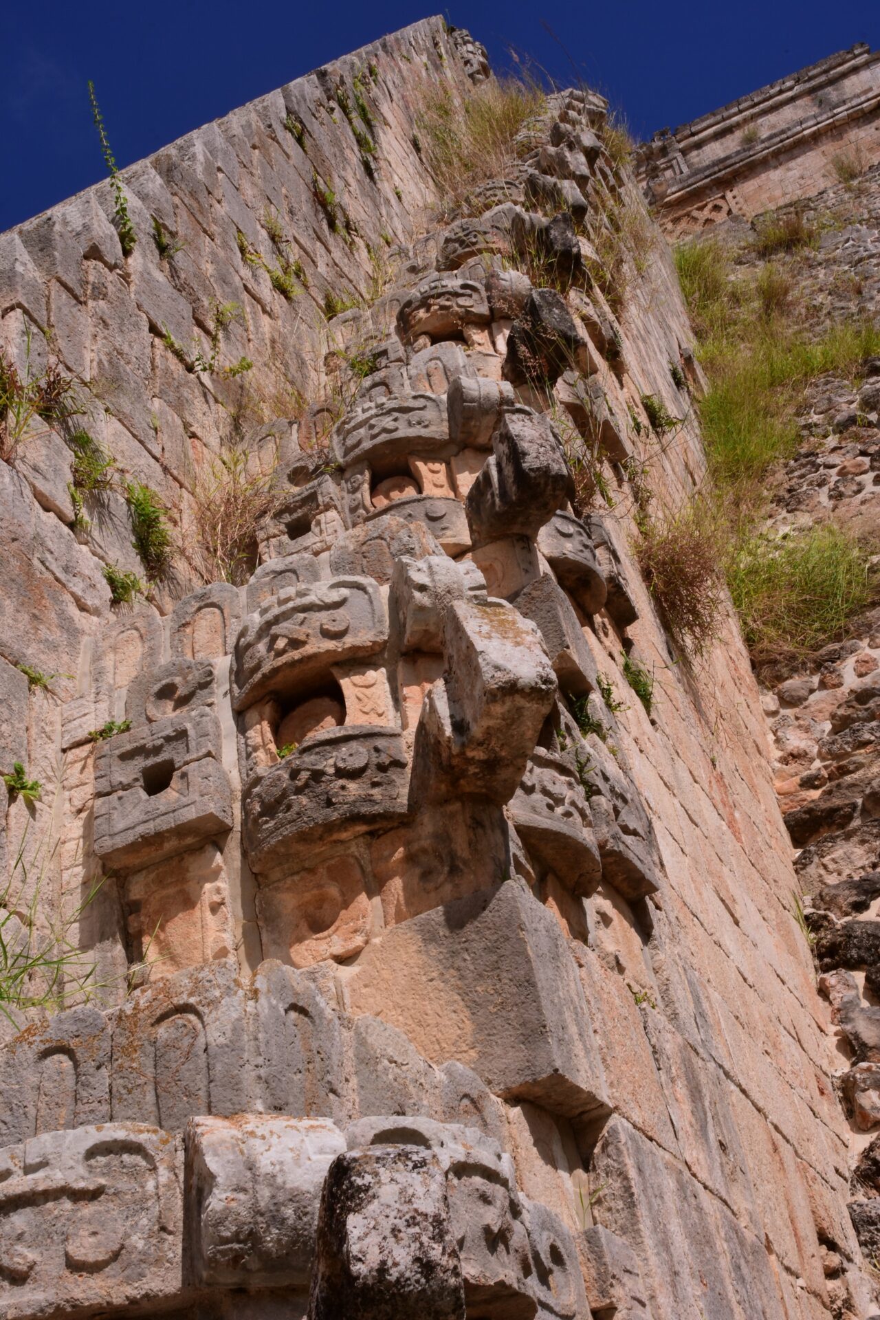 Entwined snakes and, in many cases two-headed snakes are used for masks of the rain god, Chaac; its big noses represent the rays of the storms. Feathered serpents with open fangs are shown leaving from the same human beings. Also seen in some cities are the influences of the Nahua peoples, who followed the cult of Quetzalcoatl and Tlaloc. These were integrated with the original elements of the Puuc tradition.